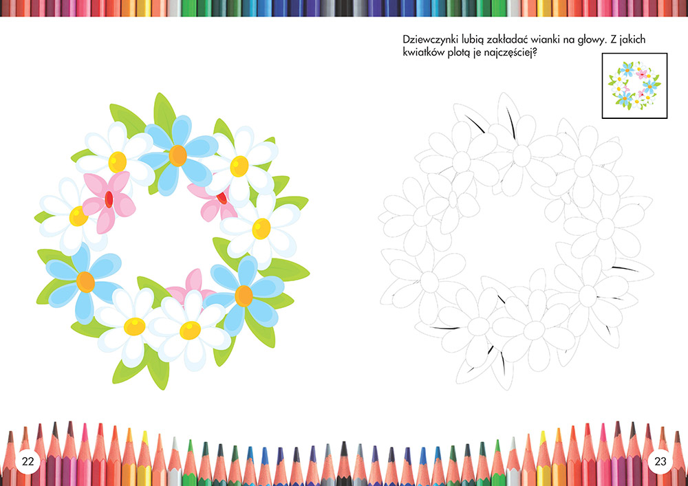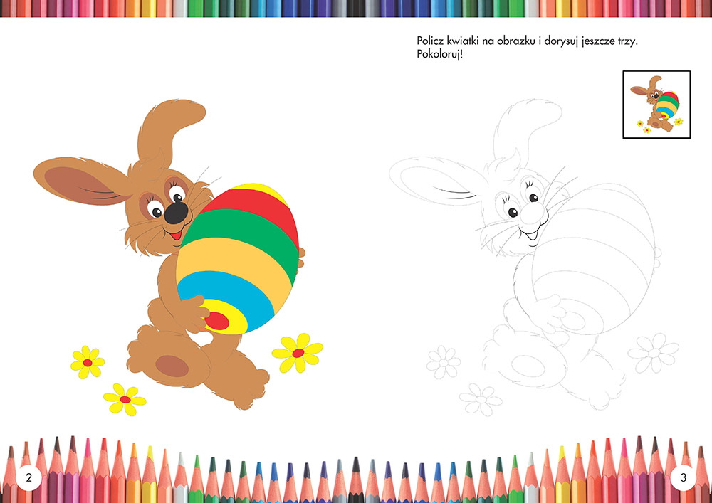 Znajdują się w niej wesołe, proste do kolorowania rysunki związane z „wiosenną” tematyką - są tu więc zwierzęta, rośliny, dzieci, ale także motywy Wielkanocne. Każdemu rysunkowi towarzyszy całostronicowy wzór pokazujący, jak go pokolorować, oraz jego miniaturka-naklejka, którą dziecko może przykleić na stronie.