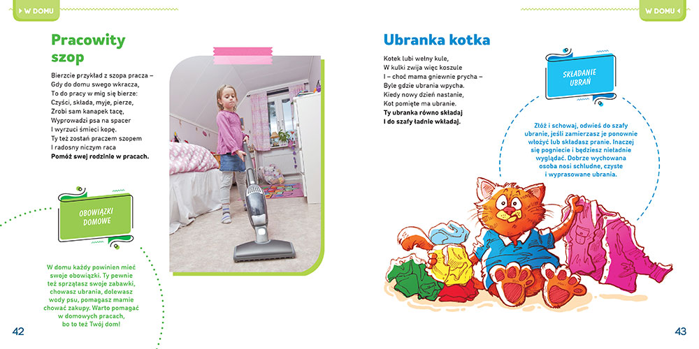 Każdemu wierszykowi towarzyszy kolorowa ilustracja lub zdjęcie oraz komentarz z dodatkowym wyjaśnieniem - nie tylko, jak się zachowywać, ale również dlaczego. Może on stanowić cenną pomoc albo stać się punktem wyjścia do ciekawych rozmów z dzieckiem.