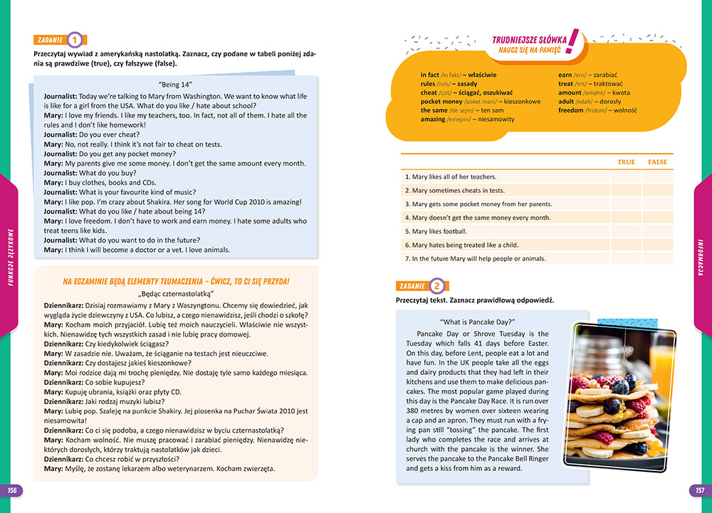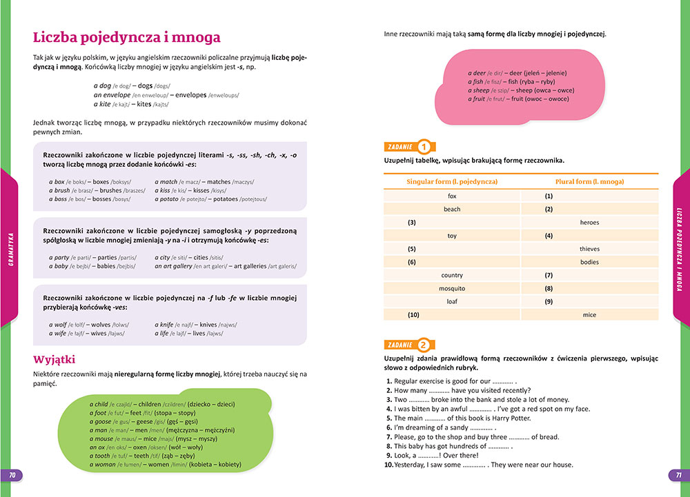 Uczeń znajdzie tu liczne ćwiczenia dotyczące słownictwa z różnych dziedzin, ćwiczenia gramatyczne wraz ze starannie wytłumaczoną teorią, dział językowy omawiający codzienne sytuacje komunikacyjne. Zadbano o to, by ćwiczenia odwzorowywały wszystkie typy zadań, jakie pojawiają się na sprawdzianach i egzaminach.