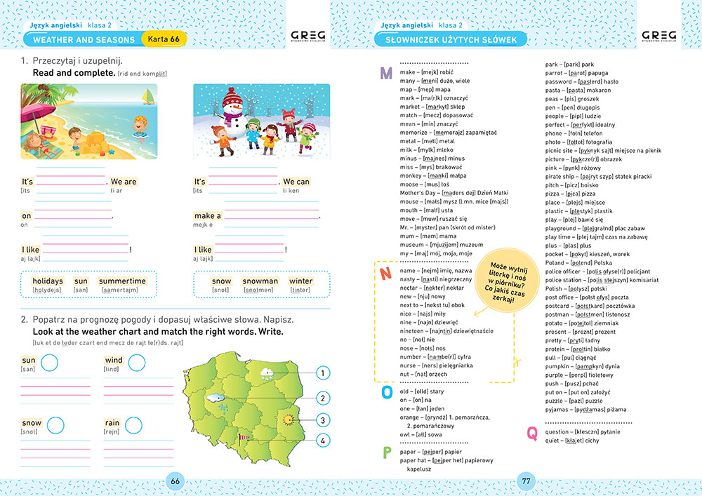 Publikacja jest ca³kowicie zgodna z wymaganiami nowej podstawy programowej. Znajduj± siê w niej dzia³y tematyczne takie same, z jakimi uczeñ spotka siê na lekcji: kolory, powitanie i po¿egnanie, alfabet, liczby, kszta³ty, szko³a, rodzina, cia³o i twarz, ubrania, dom, miasto i sklep, zawody, zabawa, zwierzêta, jedzenie, pogoda i pory roku, ¶wiêta. Niektóre dzia³y s± rozwiniêciem tematyki poruszanej w klasie pierwszej, inne s± wprowadzane dopiero na tym etapie. Wszystkie prezentuj± i utrwalaj± s³ownictwo, które uczeñ pozna w szkole oraz znajdzie w najczê¶ciej stosowanych w szkolnej praktyce podrêcznikach. Typy zadañ w pe³ni odpowiadaj± takim, jakie wystêpuj± na sprawdzianach i w podrêcznikach.