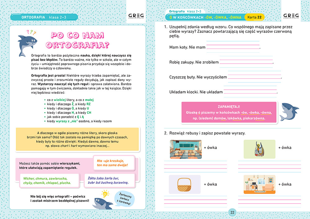 Ortografia. Karty pracy dla klas 2-3 to zbiór æwiczeñ z zakresu poprawnej pisowni, które sprawi±, ¿e ortografia przestanie byæ trudna. Karty pracy zwieraj± nie tylko zadania, ale te¿ cenne wskazówki, które pomog± je rozwi±zaæ oraz zapamiêtaæ regu³y pisowni. Na koñcu znajduje siê s³owniczek ze wszystkimi potrzebnymi wyrazami. Jedna karta z zadaniami dziennie nie zniechêca ogromem pracy, a regularne æwiczenia przynosz± trwa³e efekty.