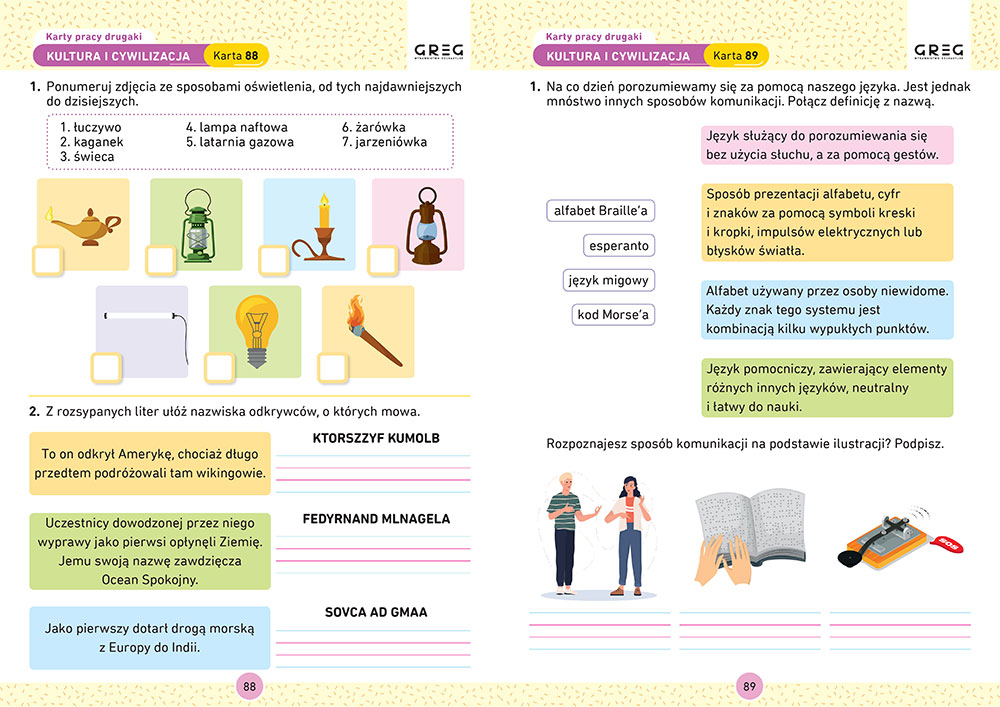 Æwiczenia doskonal± umiejêtno¶æ pisania, zapoznaj± te¿ z takimi formami, jak list, zaproszenie, og³oszenie, opowiadanie. Zadbali¶my o kolorow±, atrakcyjn± dla ma³ego ucznia oprawê graficzn±, zadania s± ciekawe i nie tylko buduj± zasób wiedzy, ale te¿ rozwijaj± umiejêtno¶ci manualne, wyobra¼niê i kreatywno¶æ. Dziêki perforacji ³atwo wyrwaæ ka¿d± kartkê z ksi±¿ki, a specjalnie dobrana kolorystyka zapewnia zachowanie czytelno¶ci w przypadku kserowania na czarno-bia³ej kopiarce.