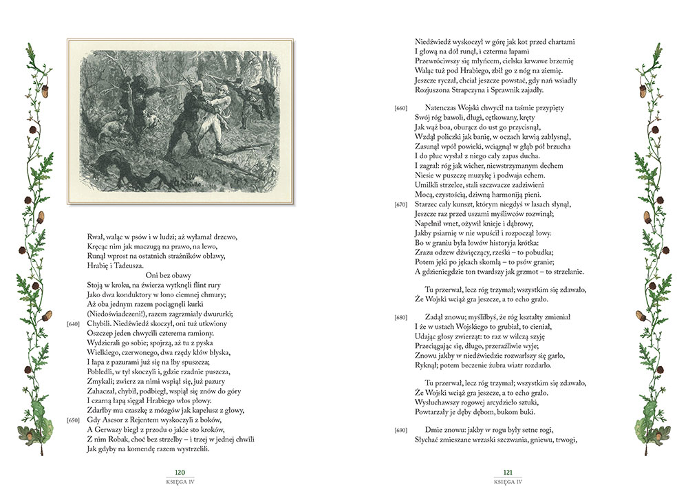 Książka od razu zwróciła na siebie moją uwagę, kiedy razem z mamą weszłam do księgarni. Twarda, barwna okładka i "bogate wnętrze" sprawiają, że całość prezentuje się okazale, a wzrok sam wędruje w kierunku książki. (...) Treść wzbogacono także o ilustracje Michała Elwiro Andriollego (artysty i rysownika, a także przyjaciela najstarszego syna Mickiewicza) z 1882 roku. Artysta w bardzo dobry sposób zinterpretował, a następnie zobrazował, treść utworu Adama Mickiewicza. Jego prace nie tylko oddają ducha epoki, ale również prezentują czar Soplicowskiego dworku, a także niezapomnianych bohaterów. Widać, że autor tych dzieł poważnie potraktował poemat i podszedł do zadania z pełną powagą oraz należytym szacunkiem (...)