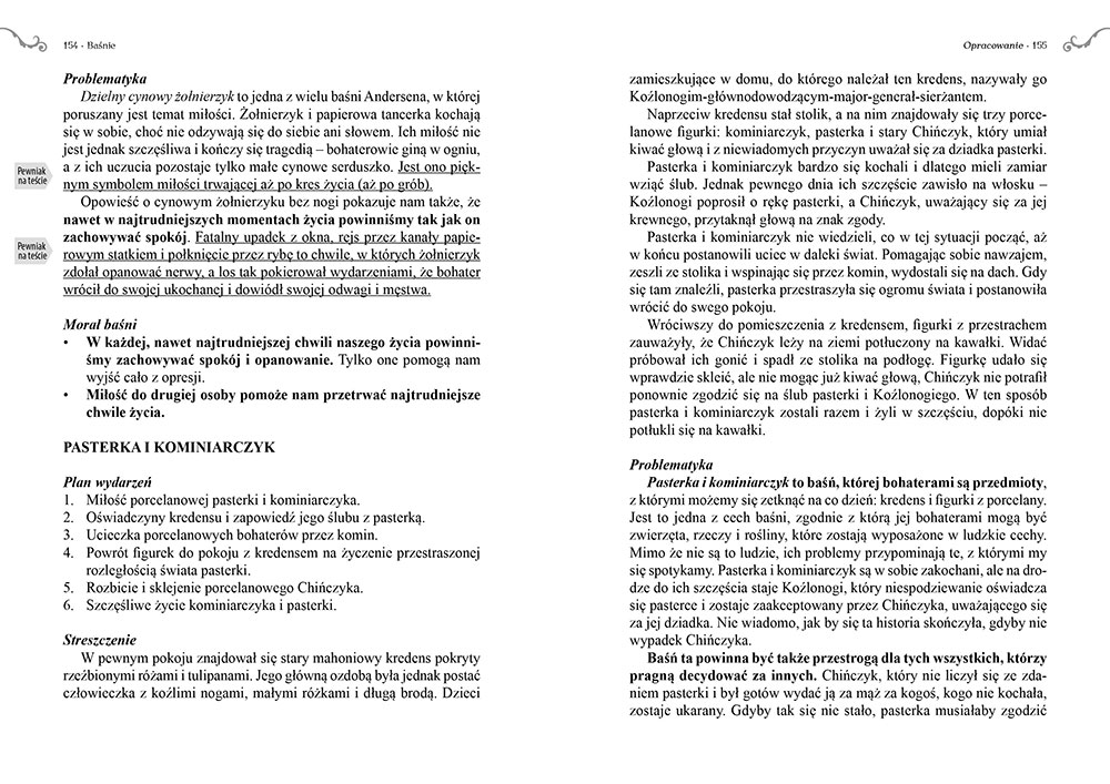 Wydanie Baśni kompletne bez skrótów i cięć w treści. W tym wydaniu znajdziesz odpowiedzi na pytania z podręcznika - „pewniak na teście”, czyli wskazanie zagadnień, które zwykle pojawiają się w pytaniach z danej lektury we wszelkich testach sprawdzających wiedzę, a także w podręcznikach i na klasówkach. Książka zawiera pełen tekst lektury. Na końcu książki zamieszczono opracowanie, w którym znajduje się bardzo szczegółowe streszczenie oraz drugie skrócone, ułatwiające szybkie przygotowanie się przed lekcją. Opracowanie zawiera ponadto plan wydarzeń, wnikliwie wyjaśnioną problematykę oraz szerokie charakterystyki bohaterów.