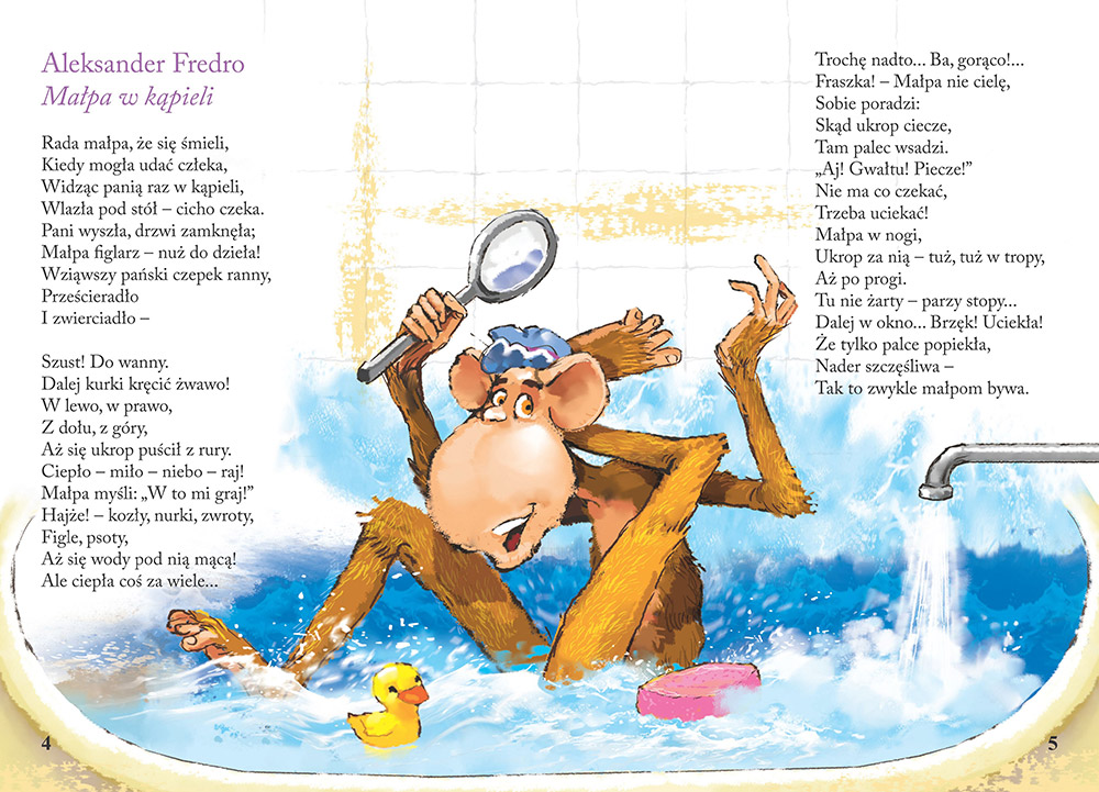 Autorami są tacy twórcy, jak Ignacy Krasicki, Aleksander Fredro, Stanisław Jachowicz, Maria Konopnicka czy Adam Mickiewicz. Na kartach tej publikacji dzieci zapoznają się ze Stefkiem Burczymuchą, poznają historię sąsiadów - Pawła i Gawła, dowiedzą się, dlaczego małpy nie powinny brać gorących kąpieli, czy będą mogły posłuchać kłótni małych wilczków czekających na powrót mamy.