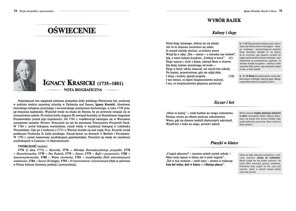 Wydanie Poezji staropolskiej z opracowaniem kompletne bez skrótów i cięć w treści. W tym wydaniu znajdziesz odpowiedzi na pytania z podręcznika - „pewniak na teście”, czyli wskazanie zagadnień, które zwykle pojawiają się w pytaniach z danego utworu we wszelkich testach sprawdzających wiedzę, a także w podręcznikach i na klasówkach. Książka zawiera tylko pełne wersje utworów, które uwzględnione zostały w programie nauczania. Innowacyjnym rozwiązaniem w tej publikacji jest zamieszczenie opracowania każdego wiersza tuż obok tekstu utworu. Każdy wiesz został omówiony wers po wersie, dzięki czemu nie będzie problemu ze zrozumieniem nawet najbardziej wymagającego dzieła.