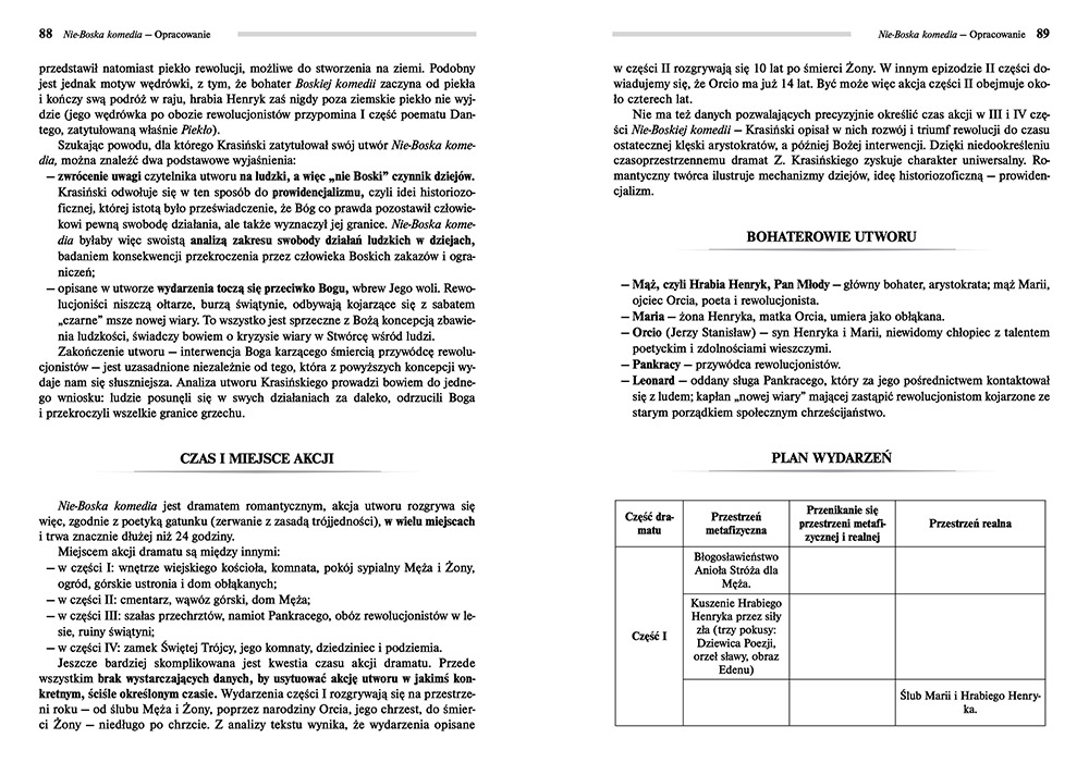 Wydanie Nie-Boskiej komedii kompletne bez skrótów i cięć w treści. W tym wydaniu znajdziesz odpowiedzi na pytania z podręcznika - „pewniak na teście”, czyli wskazanie zagadnień, które zwykle pojawiają się w pytaniach z danej lektury we wszelkich testach sprawdzających wiedzę, a także w podręcznikach i na klasówkach. Książka zawiera pełen tekst lektury. Na końcu książki zamieszczono opracowanie, w którym znajduje się bardzo szczegółowe streszczenie oraz drugie skrócone, ułatwiające szybkie przygotowanie się przed lekcją. Opracowanie zawiera ponadto plan wydarzeń, wnikliwie wyjaśnioną problematykę oraz szerokie charakterystyki bohaterów.