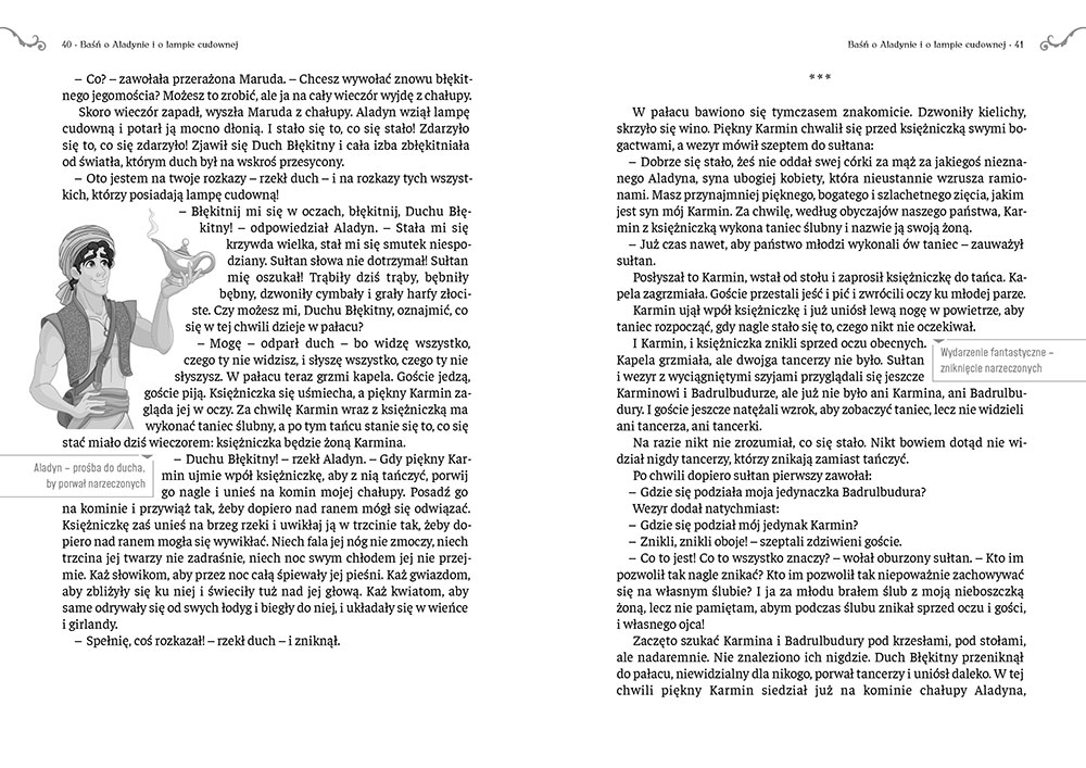Postaci Aladyna nie trzeba przedstawiać - ten chłopiec, który z ubogiego syna krawca stał się bogatym i potężnym księciem, a wszystko dzięki pewnej magicznej lampie, znany jest już kolejnym pokoleniom małych miłośników baśni. Poczytajcie o leniwym, ale zawsze mającym szczęście Aladynie, złym czarnoksiężniku o niemożliwym do wymówienia imieniu, potężnym błękitnym dżinnie, mieszkającym w zaczarowanej lampie, cudnej urody księżniczce i ich niesamowitych przygodach!