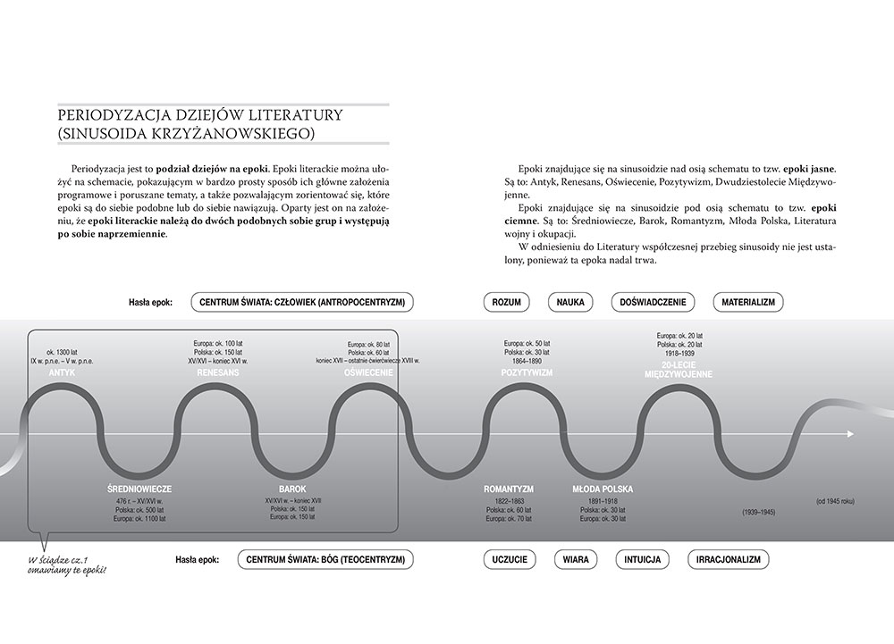 Obejmuje wszystkie lektury obowiązujące z zakresu podstawowego, które będą wymagane na sprawdzianach oraz na maturze z języka polskiego. Każda z lektur została dokładnie omówiona, zawiera streszczenia i problematykę, spis bohaterów, a całość uzupełniają notki biograficzne autorów. Ponadto zamieszczono w niej analizy i interpretacje wymaganych na języku polskim wierszy oraz omówiono cechy charakterystyczne każdej epoki literackiej. W części pierwszej, zgodnie z programem szkolnym, omówiono epoki od Antyku po Oświecenie.