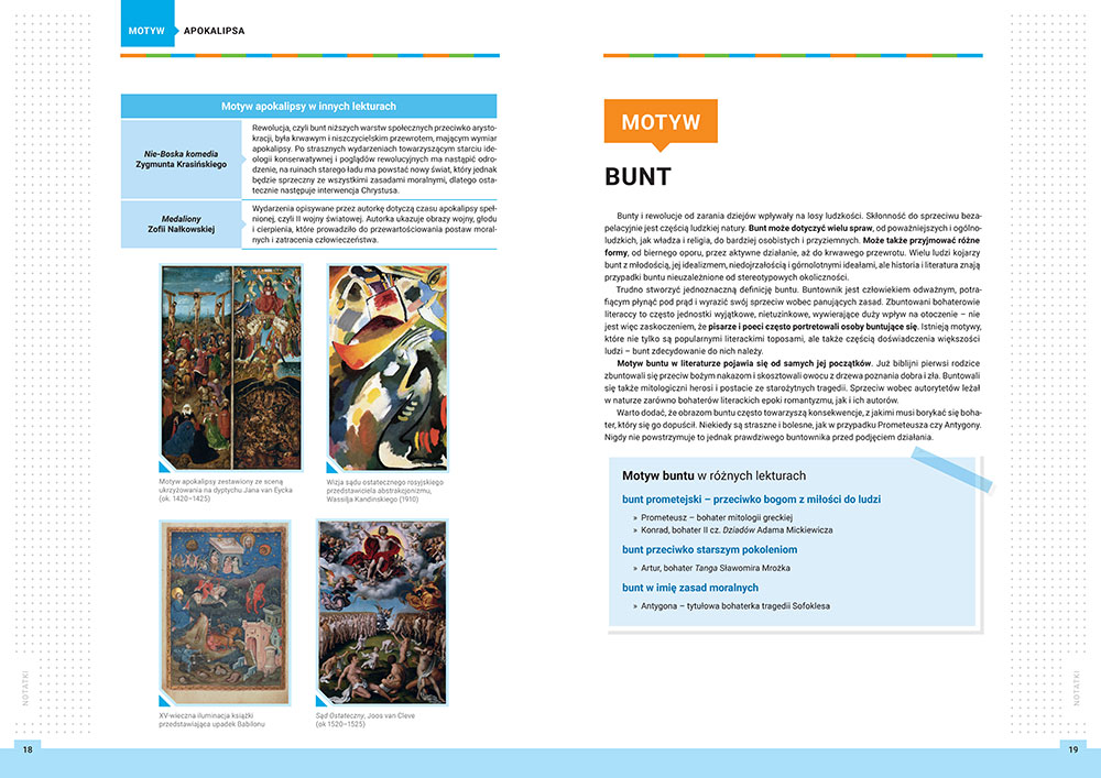 Ksi±¿ka zosta³a dostosowana do za³o¿eñ nowej podstawy programowej, która k³adzie szczególny nacisk na to, by uczeñ potrafi³ swobodnie operowaæ motywami literackimi, zestawiaæ ze sob± lektury, dostrzegaæ nawi±zania miêdzy nimi i budowaæ siatkê skojarzeñ. Z tego wzglêdu omówienia lektur w niej nie s± u³o¿one chronologicznie, lecz zebrane w grupy wed³ug motywów. Omówiono wszystkie najbardziej popularne w szkolnej praktyce motywy, takie jak bunt, wady narodowe, matka, ojciec, rewolucja, wojna, ¶mieræ i wiele innych, a g³ówny nacisk zosta³ po³o¿ony na realizacjê danego motywu w utworze. Rzecz jasna nie zapomniano te¿ o streszczeniach, omówieniu tytu³u, czasu i miejsca akcji oraz najwa¿niejszych bohaterów. Atutem s± te¿ dok³adniejsze, bardziej szczegó³owe streszczenia dostêpne pod kodami QR. Nowoczesna oprawa graficzna u³atwia pracê z ksi±¿k±.