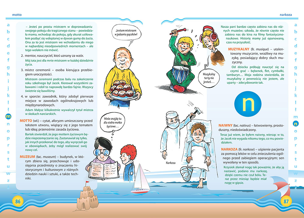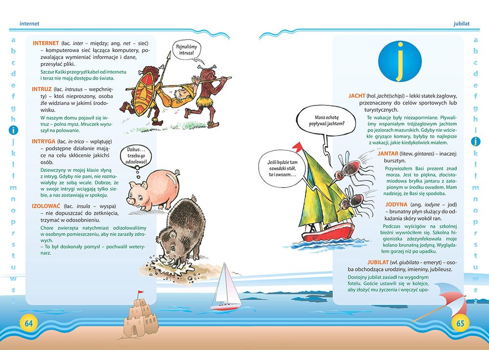 Największym atutem książki są fabularyzowane hasła, które opowiadają o życiu i przygodach bohatera - ucznia szkoły podstawowej, zmagającego się z zawiłościami języka. Jest indywidualistą heroicznie poprawiającym swoją kondycję, negocjuje oceny w szkole, jest optymistą... i dowiaduje się, co to wszystko znaczy. Dzięki temu słownik można czytać jak książkę, a przy okazji uczyć się najczęściej spotykanych słów pochodzenia obcego.